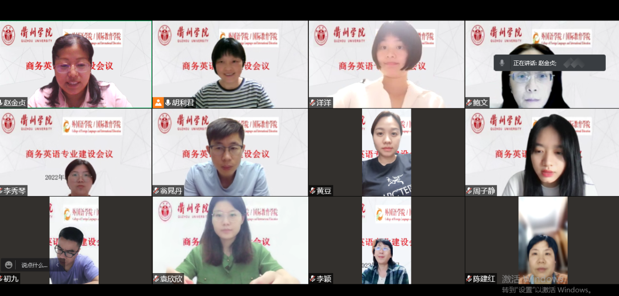 为进一步促进外国语学院商务英语专业的建设与发展,深化高校外语教学改革,加强商务英语专业教学资源的推广与应用,全面提升商务英语专业人才培养质量,更好地服务区域经济发展,5月22日晚7:30,我院线上举行了商务英语专业建设会议。会议邀请到浙江省商务英语协会副会长、浙江工商大学商务英语专业负责人鲍文教授,浙江福锐特电力科技有限公司董事长翁晁丹先生和衢州星居户外用品有限公司董事长黄宵婷女士。会议由外国语学院副院长赵金贞主持。 会上,商务英语系主任胡利君介绍了商务英语专业建设的基本情况,汇报了前期调研以及人才培养方案修改的结果。会议讨论了如何进一步形成商务英语专业建设的模式,促进商务英语专业建设迈向更新更高台阶。会议同时讨论了如何进一步凝炼人才培养方案,形成商务英语专业所在高校的人才培养共同体,加强合作交流,不断提升人才培养质量等议题。与会专家分别从专业定位、特色优势、专业改革、教学组织建设、教学质量保障体系等方面进行了细致的点评和指导,提出了针对性的意见与建议。