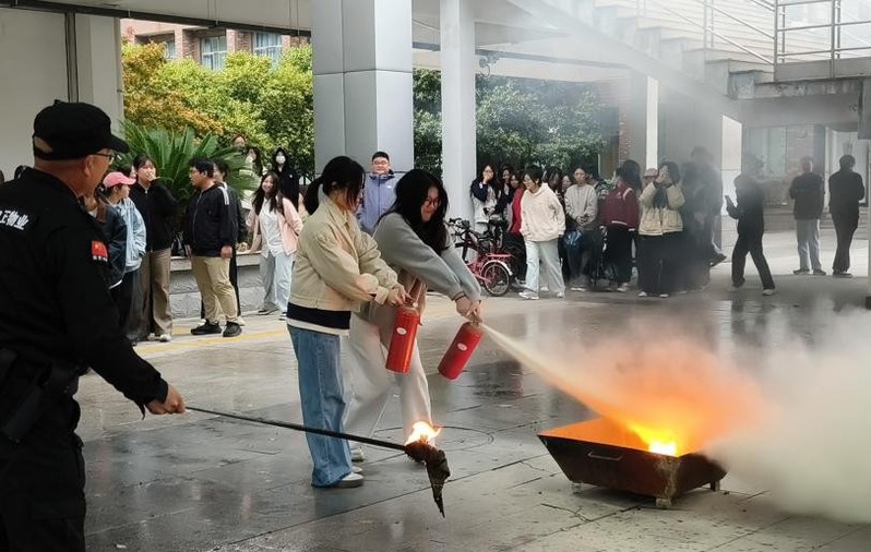 为强化师生消防安全意识,提升实验室突发事件应急处置能力,11 月 4 日 14:30-15:30,外国语学院在教 2-102、教 2-104 实验室及教学楼与图书馆间空旷场地,组织 25 商务英语学生、班主任及相关工作人员开展消防演练。 演练严格遵循“以人为本,安全第一”原则,由实验室分管领导胡兴莉副院长担任总指挥,各工作组分工明确、协同配合。演练伊始,险情模拟组释放烟雾、拉响警报,模拟实验室火情。引导疏散组迅速组织学生用衣物捂住口鼻、弯腰低姿,从实验室前后出入口有序撤离,全程快速且井然有序。随后,宣传报道组记录演练关键环节,工作人员清点疏散人数,确保全员安全抵达指定区域。 在实操环节,保卫处邱建国老师详细讲解灭火器使用原理与“提、拔、握、压”操作步骤,并现场示范。学生们分组上前实操,亲手体验灭火过程,进一步掌握消防技能。15:30,总指挥宣布演练圆满结束。