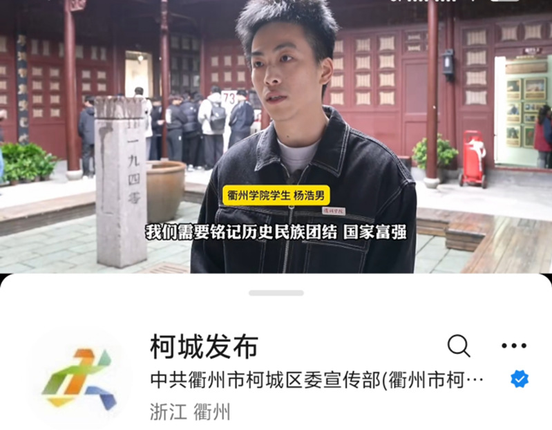 柯城发布视频号 面对媒体镜头,学生们结合参观所见,在沉痛追忆历史的同时,深切哀悼遇难同胞,更坚定了铭记历史、砥砺前行的爱国信念。这也充分证明了课程育人目标的有效达成。未来,课程组将继续深化课程思政改革,创新教学形式,将更多具有时代意义和教育价值的实践活动融入教学中,引导学生在学好日语讲好中国故事的同时,坚定文化自信,增强民族自豪感和历史责任感。此次活动不仅让学生们接受了深刻的爱国主义教育,也展现了我校学子良好的精神风貌,得到了现场各界人士的广泛好评,被央视新闻联播、浙江卫视、潮新闻、衢州新闻联播、柯城发布等各类媒体报道。(文 石泽玮) |