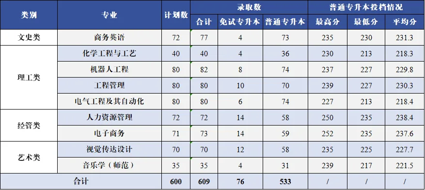 5月13日,随着浙江省普通专升本平行志愿投档完成,我校2025年专升本录取工作顺利结束,共录取商务英语、化学工程与工艺、机器人工程、工程管理、电气工程及其自动化、人力资源管理、电子商务、视觉传达设计、音乐学(师范)等9个专业609人,超额完成录取9人。 其中普通专升本录取533人、退役大学生士兵免试专升本录取76人。 普通专升本录取分数情况如下:商务英语专业录取最低分230分,高出省控线17分;化学工程与工艺专业录取最低分213分,高出省控线26分;机器人工程专业录取最低分227分,高出省控线40分;工程管理专业录取最低分227分,高出省控线40分;电气工程及其自动化专业录取最低分213分,高出省控线26分;人力资源管理专业录取最低分235分,高出省控线60分;电子商务专业录取最低分235分,高出省控线60分;视觉传达设计专业录取最低分225分,高出省控线24分;音乐学(师范)专业录取最低分217分,高出省控线16分。 衢州学院2025年专升本录取情况统计表
