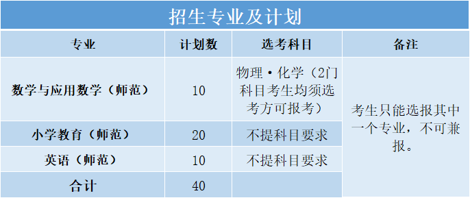 Q 1.衢州学院2025年“三位一体”招生专业有哪些变化? 2025年我校“三位一体”计划招收40人,其中,数学与应用数学(师范)10人、小学教育(师范)20人、英语(师范)10人,特别注意,考生只能选报其中一个专业,不可兼报。与去年有所不同的是,今年我校暂停了学前教育(师范)和汉语言文学(师范)专业在“三位一体”招生。