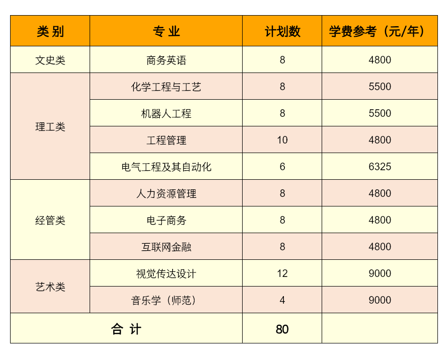 注:1.考生只能选择其中一个类别,跨类别填报的志愿无效;2.招生计划以浙江省教育考试院公布为准。 (二)高职高专阶段所学专业要求 1.商务英语:高职高专阶段所学专业为国际经济与贸易、国际贸易实务、国际商务、跨境电子商务、英语教育、商务英语、应用英语、旅游英语的考生可报考。 2.化学工程与工艺:高职高专阶段所学专业为绿色食品生产与检验、绿色食品生产技术、油气储运技术、环境监测与控制技术、环境监测技术、环境工程技术、绿色低碳技术、安全健康与环保、职业健康安全技术、安全技术与管理、工程安全评价与监理、安全生产监测监控、安全智能监测技术、材料工程技术、高分子材料工程技术、理化测试与质检技术、新能源汽车技术、食品生物技术、化工生物技术、药品生物技术、应用化工技术、石油炼制技术、石油化工技术、精细化工技术、工业分析技术、分析检验技术、化工装备技术、化工智能制造技术、化妆品技术、食品加工技术、食品智能加工技术、酿酒技术、食品质量与安全、食品营养与健康、食品检测技术、食品检验检测技术、食品营养与检测、药品生产技术、药品质量与安全、制药设备应用技术、化学制药技术、生物制药技术、中药制药技术、中药制药、药物制剂技术、化妆品质量与安全、药学、化学教育的考生可报考。 3.机器人工程:高职高专阶段所学专业为设施农业与装备、工程测量技术、供用电技术、机械设计与制造、机械制造与自动化、机械制造及自动化、数控技术、精密机械技术、材料成型与控制技术、材料成型及控制技术、机械产品检测检验技术、模具设计与制造、电机与电器技术、机械装备制造技术、机电设备维修与管理、数控设备应用与维护、智能制造装备技术、新能源装备技术、光电制造与应用技术、智能光电制造技术、机电一体化技术、电气自动化技术、工业过程自动化技术、智能控制技术、电梯工程技术、工业机器人技术、船舶机械工程技术、游艇设计与制造、飞行器制造技术、飞行器数字化制造技术、无人机应用技术、汽车制造与装配技术、汽车制造与试验技术、汽车检测与维修技术、汽车电子技术、新能源汽车技术、化工装备技术、包装工程技术、纺织机电技术、轮机工程技术、飞机机电设备维修、通用航空器维修、城市轨道交通车辆技术、城市轨道车辆应用技术、城市轨道交通机电技术、电子信息工程技术、应用电子技术、智能产品开发、智能产品开发与应用、智能监控技术应用、汽车智能技术、电子制造技术与设备、声像工程技术、人工智能技术服务、人工智能技术应用、通信技术、现代通信技术、光通信技术的考生可报考。 4.工程管理:高职高专阶段所学专业为工程测量技术、环境工程技术、绿色低碳技术、工程安全评价与监理、装配式建筑构件智能制造技术、建筑设计、建筑装饰工程技术、古建筑工程技术、建筑室内设计、园林工程技术、建筑动画与模型制作、建筑动画技术、城市信息化管理、智慧城市管理技术、建筑工程技术、地下与隧道工程技术、装配式建筑工程技术、建筑钢结构工程技术、建筑设备工程技术、智能建造技术、建筑电气工程技术、建筑智能化工程技术、建设工程管理、工程造价、建筑经济管理、建筑经济信息化管理、建设项目信息化管理、建设工程监理、市政工程技术、给排水工程技术、房地产经营与管理、房地产检测与估价、房地产智能检测与估价、水利工程、水利水电工程管理、水利水电工程智能管理、水利水电建筑工程、铁道工程技术、智能交通技术运用、智能交通技术、道路桥梁工程技术、道路与桥梁工程技术、港口与航道工程技术的考生可报考。 5.电气工程及其自动化:高职高专阶段所学专业为安全生产监测监控、安全智能监测技术、发电厂及电力系统、供用电技术、电力系统自动化技术、高压输配电线路施工运行与维护、电厂热能动力装置、风力发电工程技术、电机与电器技术、数控设备应用与维护、智能制造装备技术、电气自动化技术、工业过程自动化技术、智能机器人技术、智能控制技术、船舶电气工程技术的考生可报考。 6.人力资源管理:无要求。 7.电子商务:无要求。 8.互联网金融:无要求。 9.视觉传达设计:高职高专阶段所学专业为建筑室内设计、建筑动画技术、建筑动画与模型制作、工业设计、包装策划与设计、动漫制作技术、数字媒体技术、数字媒体应用技术、艺术设计、视觉传达设计、视觉传播设计与制作、广告艺术设计、广告设计与制作、数字媒体艺术设计、产品艺术设计、室内艺术设计、展示艺术设计、环境艺术设计、包装艺术设计、动漫设计、游戏艺术设计、游戏设计、摄影与摄像艺术、书画艺术、美术、新闻采编与制作、广播影视节目制作、影视编导、影视多媒体技术、影视动画、摄影摄像技术、美术教育的考生可报考。 10.音乐学(师范):高职高专阶段所学专业为表演艺术、戏剧影视表演、歌舞表演、戏曲表演、曲艺表演、舞蹈表演、时尚表演与传播、服装表演、模特与礼仪、现代流行音乐、音乐制作、钢琴调律、舞蹈编导、音乐表演、早期教育、学前教育、音乐教育的考生可报考。 第十五条 报名条件 (一)普通高校高职(专科)毕