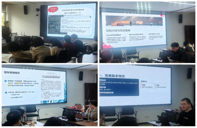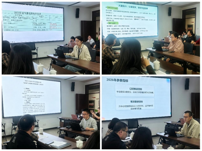 为进一步提升教师学科竞赛指导能力,促进竞赛指导经验交流,强化相关经验的总结提升,4月14日下午外国语学院特举办学科竞赛指导经验交流与能力提升教师发展活动。会议邀请教师教育学院陈静教授,商学院毛维青副教授,创业学院翁盛槟高级实验师做相关竞赛汇报的点评指导和经验分享。活动由学院副院长赵金贞主持,全体竞赛指导教师参会交流。 活动伊始,外国语学院14支竞赛指导团队负责人围绕2023-2025年负责竞赛相关内容进行汇报与交流。汇报围绕各赛项核心特点、能力素养要求、省赛入围名额、备赛全流程等关键内容展开。各位负责人结合实际案例,深入剖析备赛过程中的问题短板,针对性分享改进策略、资源整合思路与优化路径,为后续竞赛提质增效凝聚了共识。与会教师热烈参与讨论。与会教师积极互动、热烈研讨,在交流碰撞中拓宽了指导思路、明晰了改进方向。